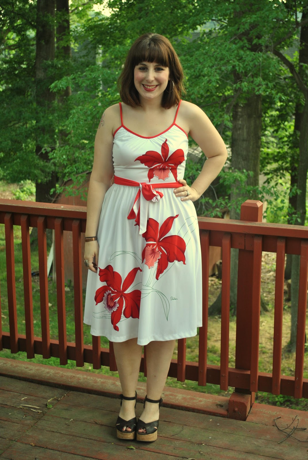 The weather was still steamy, even at dinnertime, but that meant it was the perfect time to pull out a vintage dress I've been hoarding in my closet for a few months. It's a 70s Alfred Shaheen with screenprinted hibiscus flowers. And one of the best parts? It has built in cups, so you don't have to wear a bra and disrupt the "look." (Plus, strapless bras are such a pain when it's so hot and sticky. I'd almost rather go free!) I can see myself wearing this a lot this summer...next time, I think I'm going to try a different vintage belt.